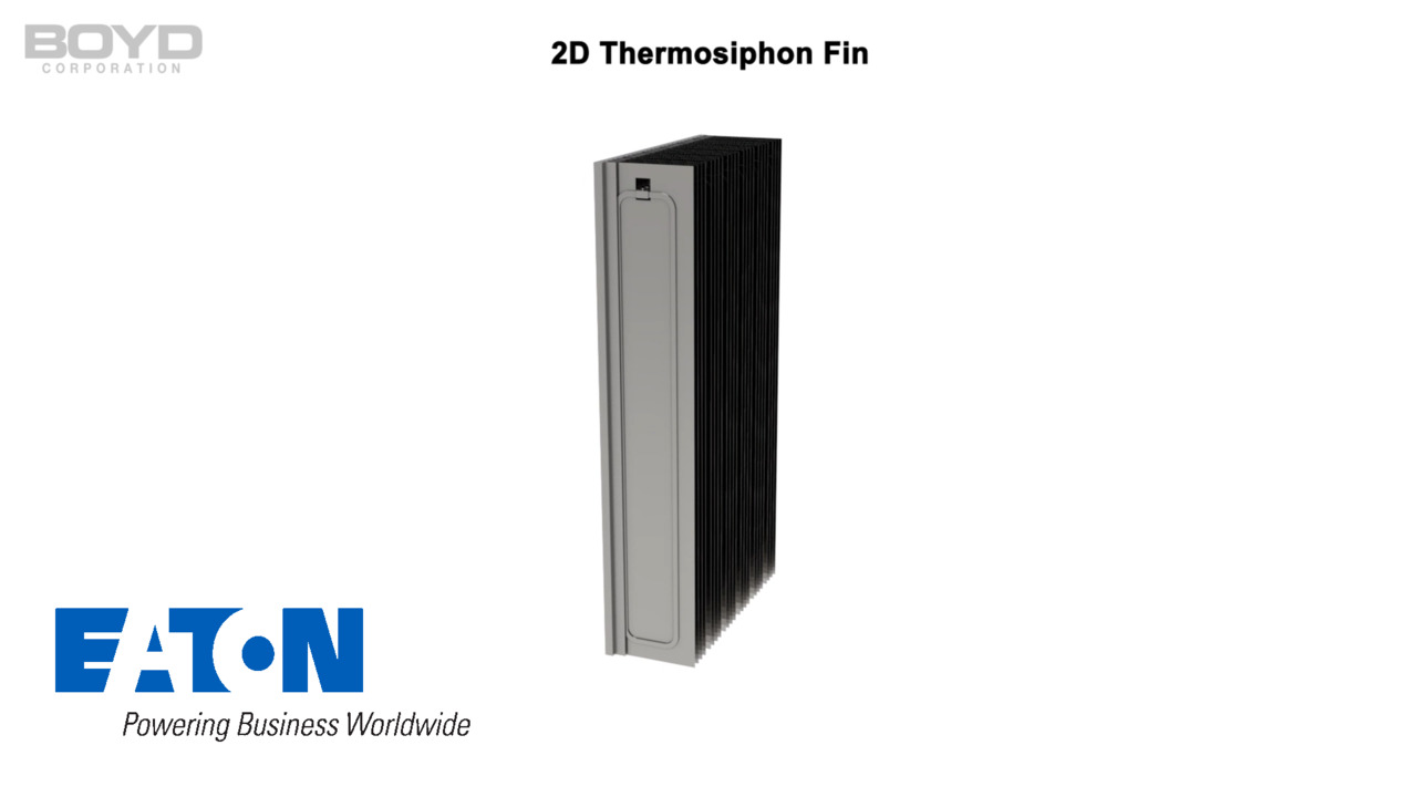 Heat Sinks utilizing 2D Thermosiphon Fin reduce weight and improve performance over similar die-cast, bonded fin, and extruded heat sinks. Designers can improve fin efficiencies for heat sinks with tall fins ( Greater than 80mm) by introducing 2D Thermosiphon Fin that aid in fin efficiency and spreading along the airflow direction. Learn More: www.boydcorp.com/thermal/two-phase-cooling/thermosiphons/thermosiphon-heat-transport-assemblies.html