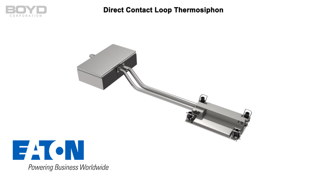 Remote Cooling Thermosiphon Assemblies transport heat from source to air, where they’re used to transport heat away from thermal loads and into a high density fin stack to dissipate heat to ambient. Carefully angled tubes carry the thermosiphon working fluid to and from the remote condenser/Liquid to Air Heat exchanger portion of the assembly. Remote Cooling Thermosiphons move more heat over longer distances and with fewer tubes than a similar heat pipe assembly, reducing system complexity and costs. This Thermosiphon configuration is common in Enterprise applications for cooling high performance components like CPUs and GPUs to a remote area that has more volume for a cooling. Learn More: www.boydcorp.com/thermal/two-phase-cooling/thermosiphons/thermosiphon-heat-transport-assemblies.html