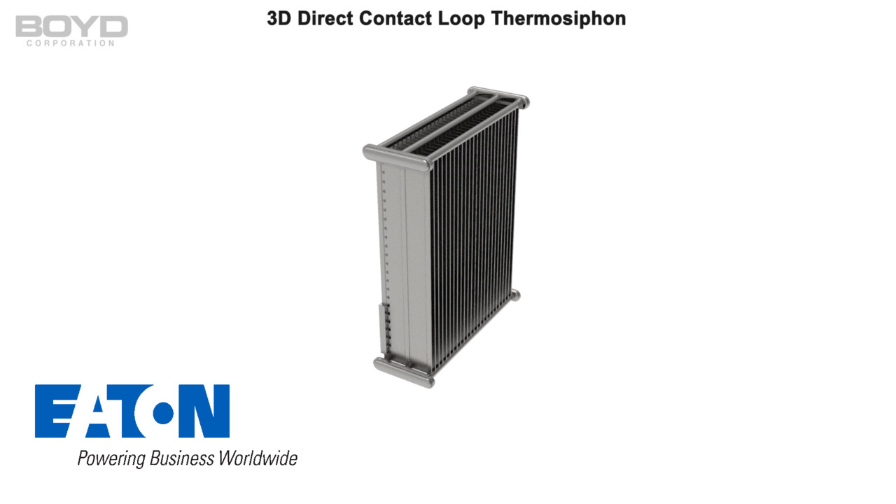 Thermosiphons that dissipate heat directly from a heat source in the adjacent volume are considered 3D Direct Contact Loop Thermosiphons. Thermosiphons collect large quantities of heat at the evaporator unit and buoyancy brings heated vapor vertically up to the condenser region. The condenser region can be configured for vertical air flow (like the diagram above) or a horizontal liquid to air heat exchanger unit. Learn More: www.boydcorp.com/thermal/two-phase-cooling/thermosiphons/thermosiphon-heat-transport-assemblies.html